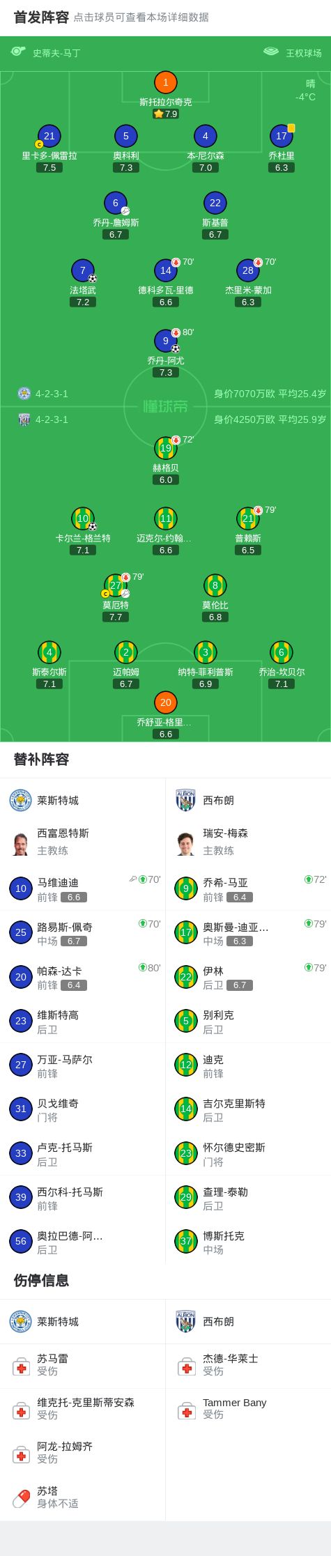 北京时间1月6日英格兰足球冠军联赛 联赛 第26轮,莱斯特城主场对阵西布朗。莱斯特城乔丹-阿尤破门,法塔武破门。西布朗卡尔兰-格兰特破门。最终比分莱斯特城 2-1 西布朗。